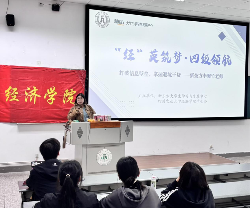 为帮助学生精准把握英语四级考试规律,明晰备考方向,提升应试能力与英语综合素养,四川农业大学经济学院于2025年10月28日在四教隆重举办“‘经’英筑梦·四级领航”专题讲座。本次讲座由经济学院学生会学习部联合新东方大学生学习与发展中心共同主办,特邀新东方资深讲师李馨竹老师主讲,凭借专业的备考指导吸引力,经济学院各专业学子共150余人积极参与。
