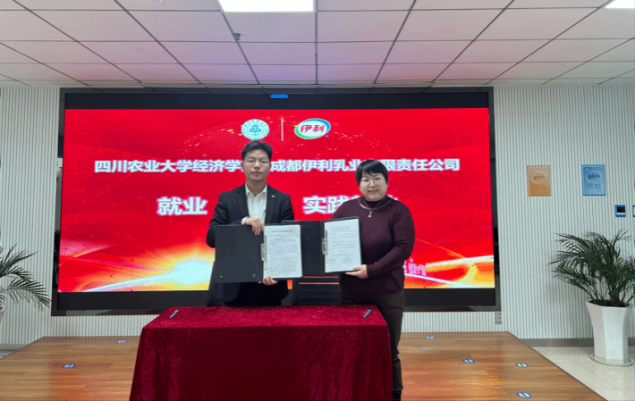 参观结束后,双方举行了“就业(社会)实践基地”签约授牌仪式。经济学院党委办公室主任、团委书记朱玉与成都伊利乳业有限责任公司人力资源负责人冯经理共同签署合作协议,正式确立合作关系。此举标志着双方将在人才培养、实习实践等领域建立常态化互动机制,为在校学生提供更贴近产业的实践平台。