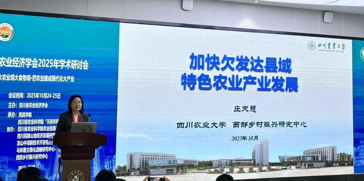 庄天慧教授作题为《加快欠发达县域特色农业产业发展》的大会主旨报告。她着眼巩固拓展脱贫攻坚成果,立足四川省欠发达县域发展实际,在15个县实地调研基础上,系统总结了特色农业产业发展和联农带农成效,并针对产业发展与政策落地中面临的难点堵点,提出优化产业支持政策、做足土特产文章、提升帮扶协作质效、强化基础设施、科技支撑和金融保险等,夯实产业高质量发展关键支撑。报告内容针对性、前瞻性强,为破解欠发达县域特色农业产业高质量发展提供了重要政策参考,赢得全场热烈掌声和强烈共鸣。