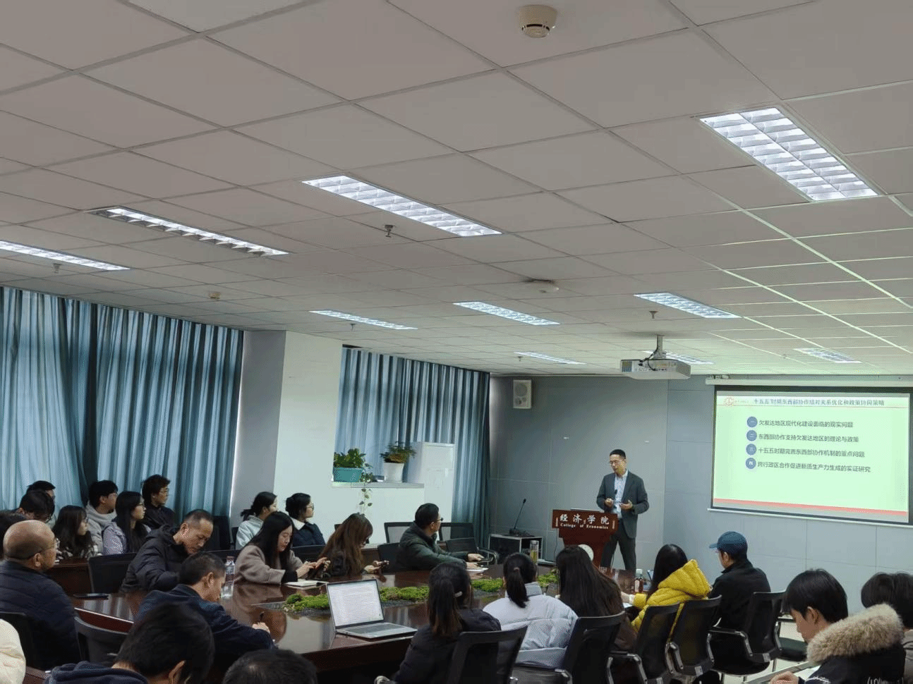 为服务国家区域协调发展战略、拓展学术研究视野,12月3日下午,经济学院“经济大讲堂”特邀西南民族大学经济学院副院长、博士生导师单德朋教授作专题学术报告。报告主题为《“十五五”时期东西部协作结对关系优化与政策协同策略——基于跨区域合作促进新质生产力生成的视角》。报告会由经济学院副院长杨浩教授主持,学院60余名师生参与,现场学术氛围浓厚。