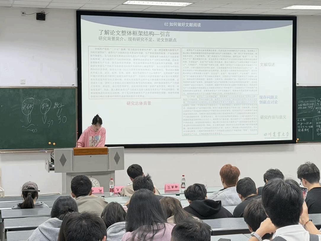 硕士研究生谢奕旻结合自身高分实践经验,以具体案例“手把手”指导同学们规范学术写作,尤其贴合专业学位研究生的培养需求。他以“数字化绿色化协同对县域产业发展”为例,拆解读书报告的核心结构,清晰指出现有研究缺口;再以“温江花木产业链数字化转型”为题,完整展示开题报告的写作框架,从选题意义、概念界定到研究目标、方法,再到技术路线、进度安排与创新点,讲解细致、通俗易懂。他强调,专硕研究生要坚持“问题导向”,聚焦现实需求、找准问题症结、提出可行对策,同时重申学术诚信、文献规范、调研严谨等“硬要求”,为同学们树立了可学习、可借鉴的榜样。