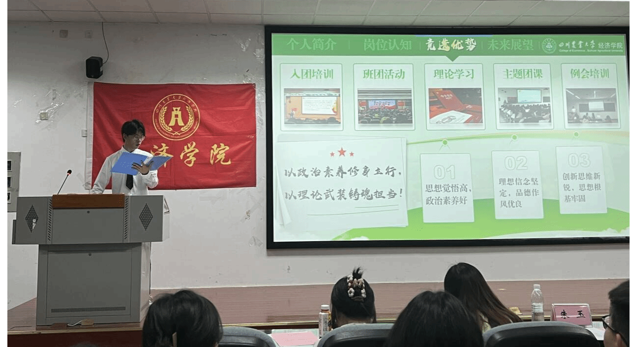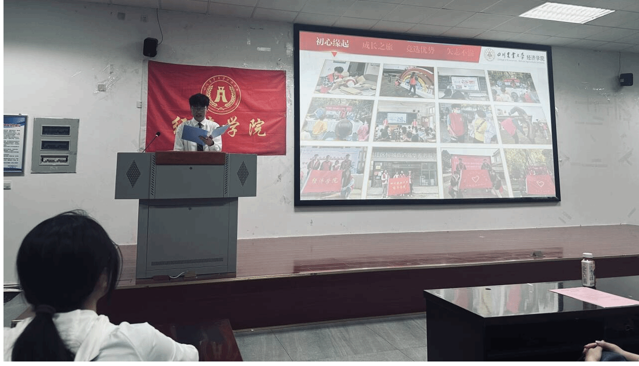 2025年5月16日,四川农业大学经济学院第八届学生代表大会春季述职暨换届选举大会在4A102顺利召开。学院党委办公室主任、团委书记钟贝老师、学院党委办公室副主任、团委副书记朱玉老师、学院辅导员武方琨老师,第十届学生会主席团成员、部门负责人及第八届学生代表大会全体正式代表参加大会,共同见证学生会工作的总结回顾与薪火相传。