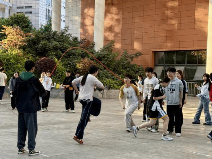 绳索翻飞间,跳绳训练场浸润在交织的风声、笑声与鼓励声里,热闹非凡。只见两位同学攥紧绳柄挥绳,在空中划出优美弧线。其余队员踩着节拍一步一跳,动作行云流水。偶有人被绳打到胳膊,揉一揉便立刻归队训练,没人喊苦喊累。教练全程守在旁侧,及时纠正节奏、跳跃高度等细节问题。随着训练深入,队员们的节拍与动作一气呵成,配合愈发默契。这份扎实的训练,正是大家奔赴校运会的底气。