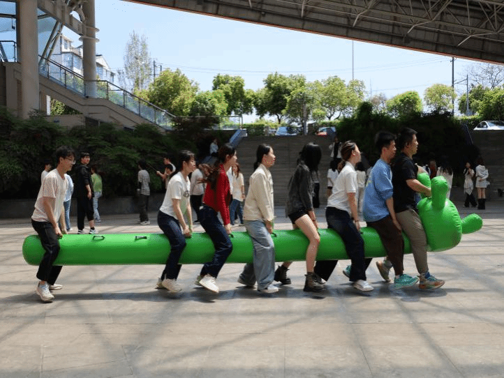 毛毛虫竞速的赛道上,团结的力量格外耀眼。队员们跨坐充气道具上,齐喊口号,试着迈出整齐步伐。起初步频不一,道具东倒西歪,训练屡屡受挫,却无人抱怨放弃,只是一遍遍投入练习。从磕磕绊绊到默契无间,经院学子以团结与坚持,书写着奋进篇章。