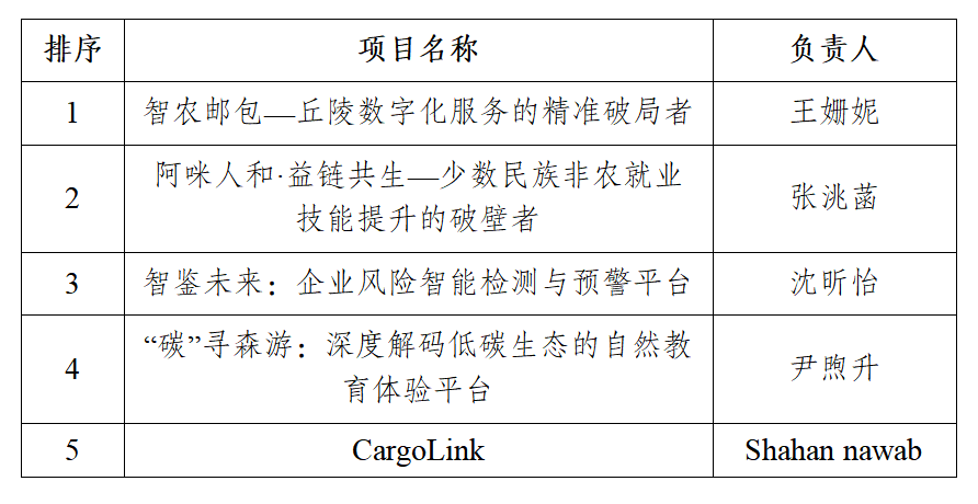 按照学校《关于第十五届“挑战杯”中国大学生创业计划竞赛校内预选赛及校内重点项目(第一轮)遴选的通知》要求,经学院同学自愿申请,学院组织答辩和评选,最终评选出5支参赛团队拟推校赛复赛,现将结果予以公示: